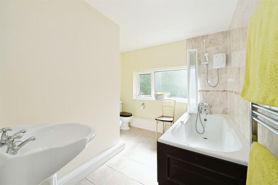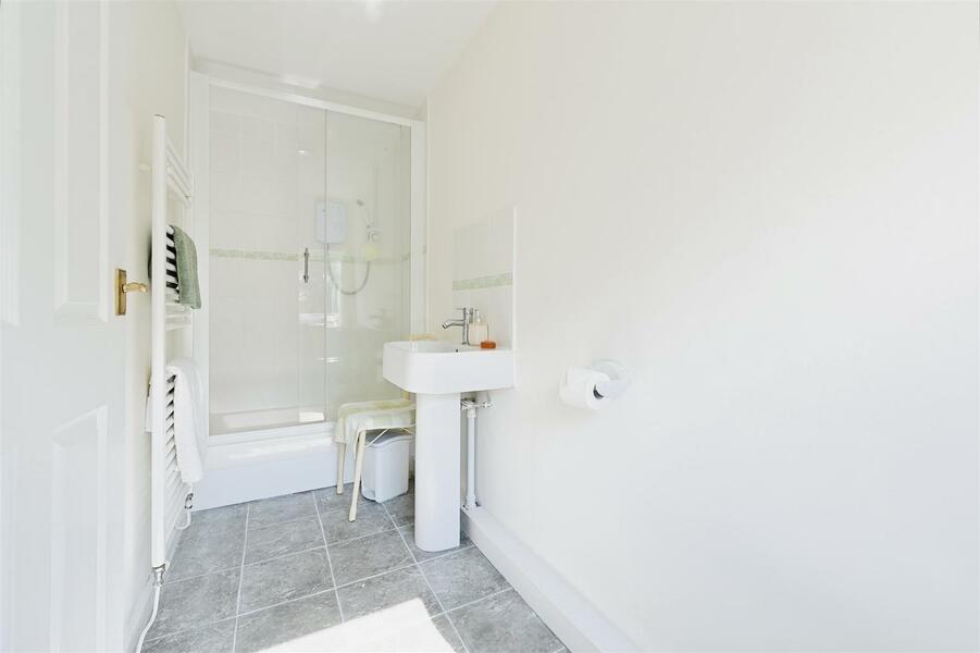 Double glazed window to side. Fitted with a fully tiled double shower cubicle, pedestal wash hand basin and low level w.c. Tiled floor. Heated towel rail.