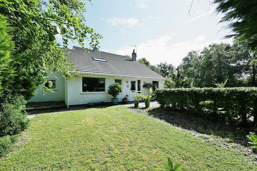 The property is approached via a driveway leading to a gravelled parking area with lawn to side.