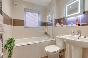 Double glazed window to rear. Fitted with a bath with shower over, pedestal wash hand basin and low level w.c. Walls and floor fully tiled. Wall mounted radiator/heated towel rail.
