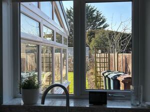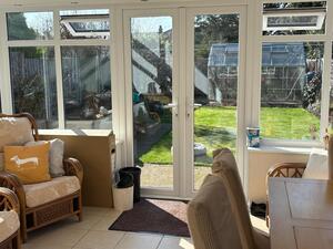 A lovely addition to this property providing an additional reception room, with solid roof and glazed to three elevations. Tiled floor. French doors to gardens.