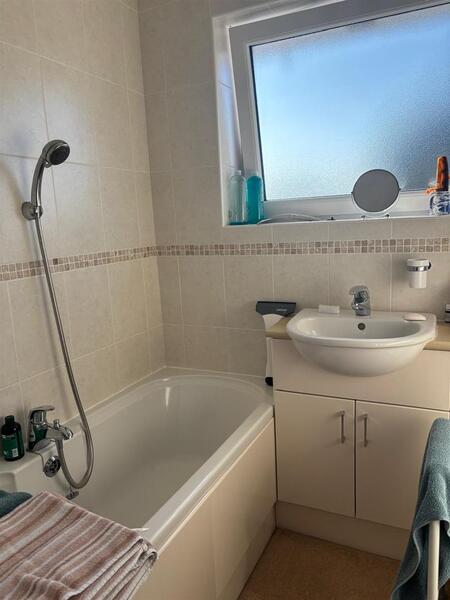Double glazed opaque tilt and turn window to rear. Fitted with a panelled bath, vanity wash hand basin with storage beneath and incorporating concealed cistern w.c. Tiled walls. Heated towel rail.